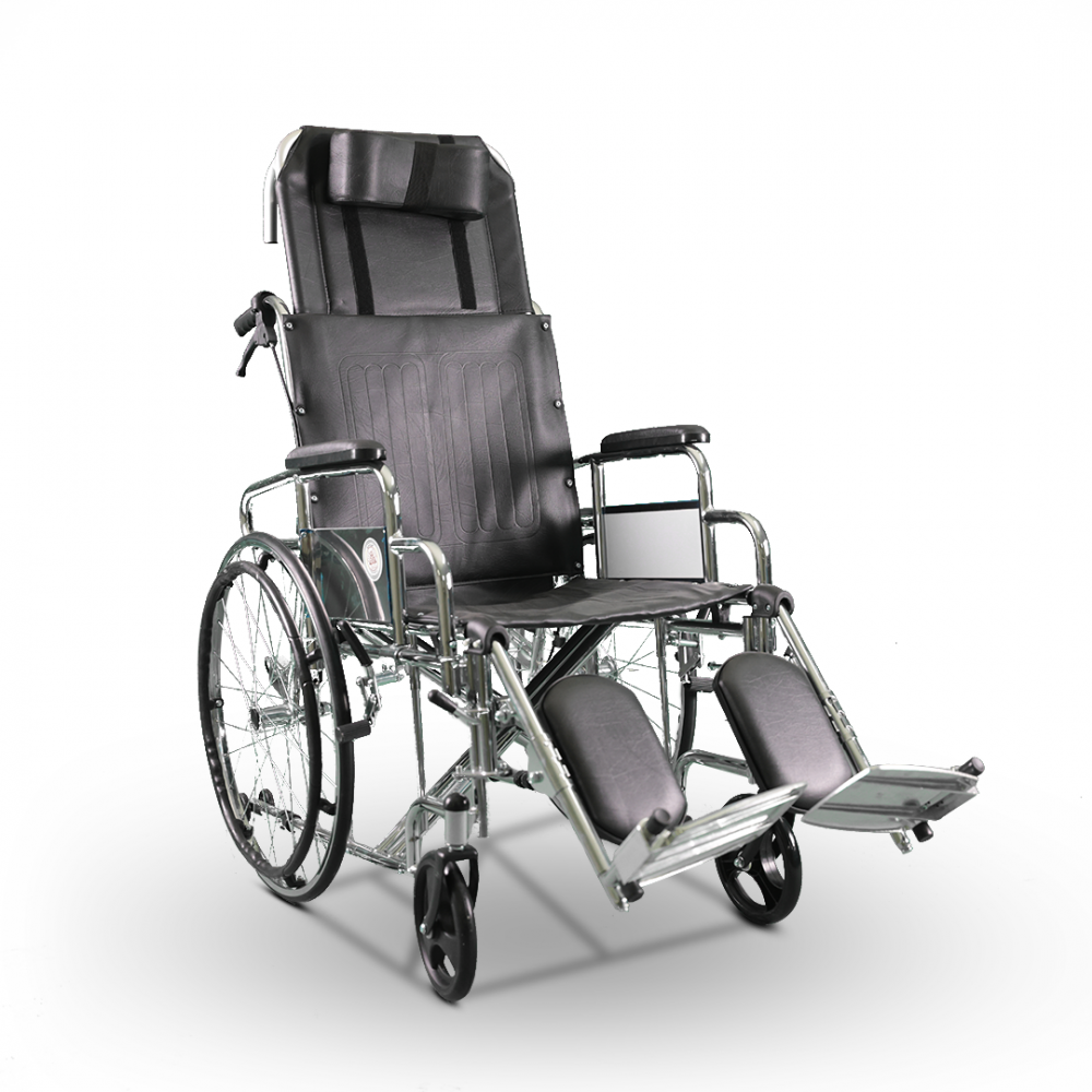 كرسي متحرك بمساند قدم متحركة وظهر مائل لراحة أكبر
